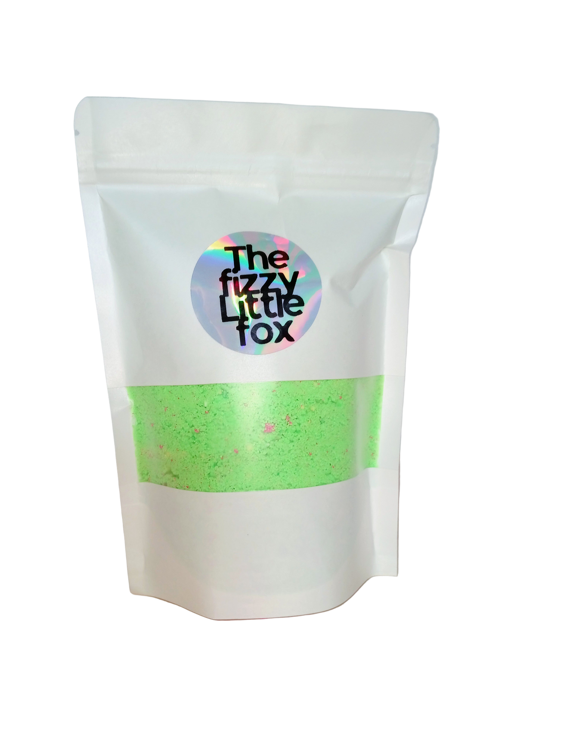 Ingredients: Sodium bicarbonate, citric acid, epsom salts, kaolin clay , dry flo , cream of tartar, fractionated coconut oil , fragrance, polysorbate 80, isopropyl alcohol ,colours( polyurethane 11, chromium oxide green, CI 47005, CI 74180)Min weight 340g